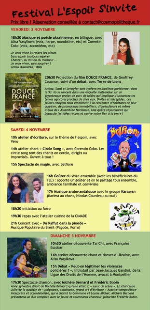 Voici le programme complet du 6ème festival annuel L’Espoir S’invite les 3-4-5 novembre de la Cosmopolithèque !