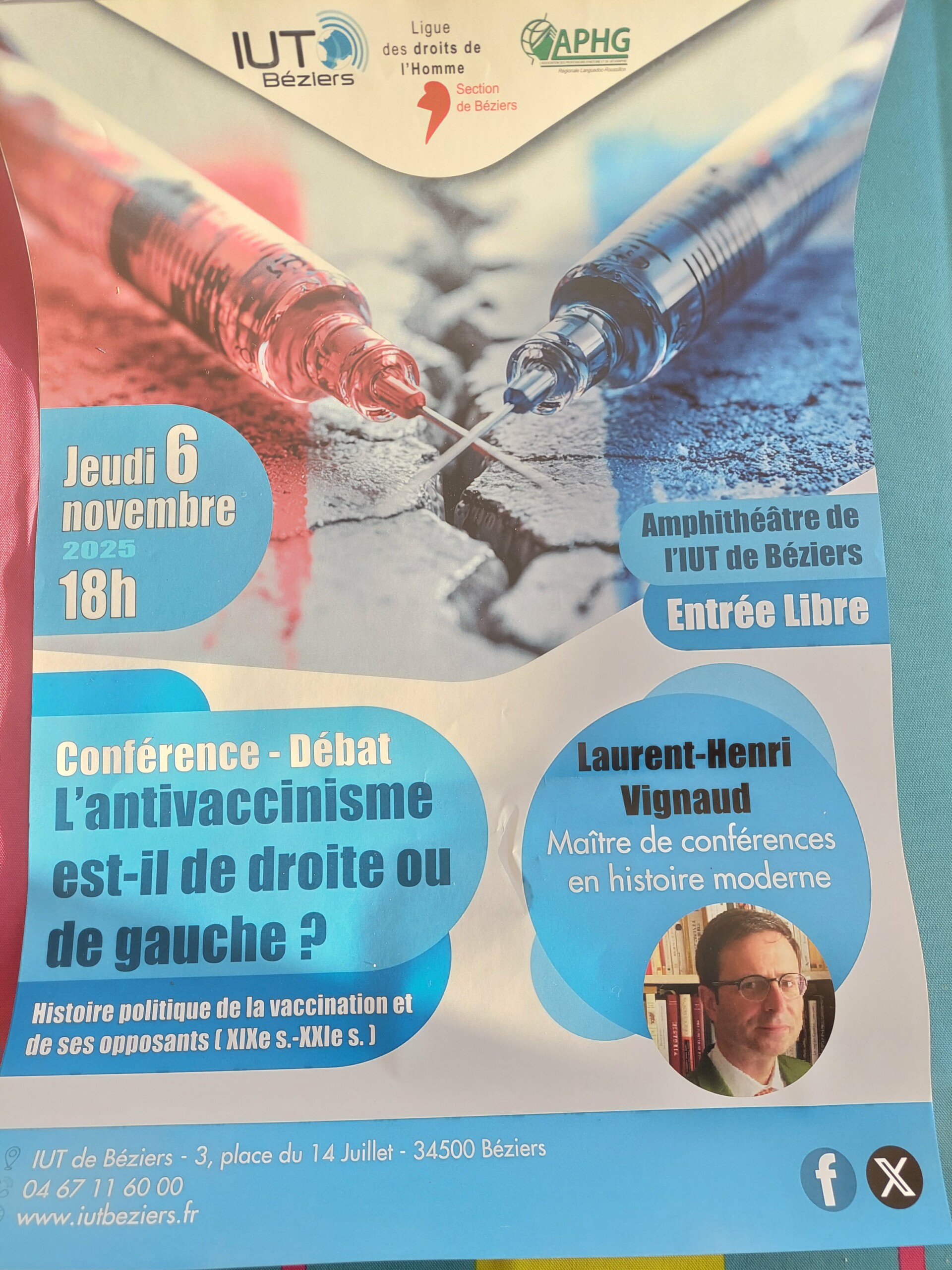 Elle s’adresse à toute personne intéressée par les questions politiques contemporaines et les enjeux liés aux politiques de santé publique. Informations pratiques : • Jeudi 6 novembre 2025 18h à l’IUT de Béziers • Conférence gratuite, ouverte à tous, sans inscription préalable.