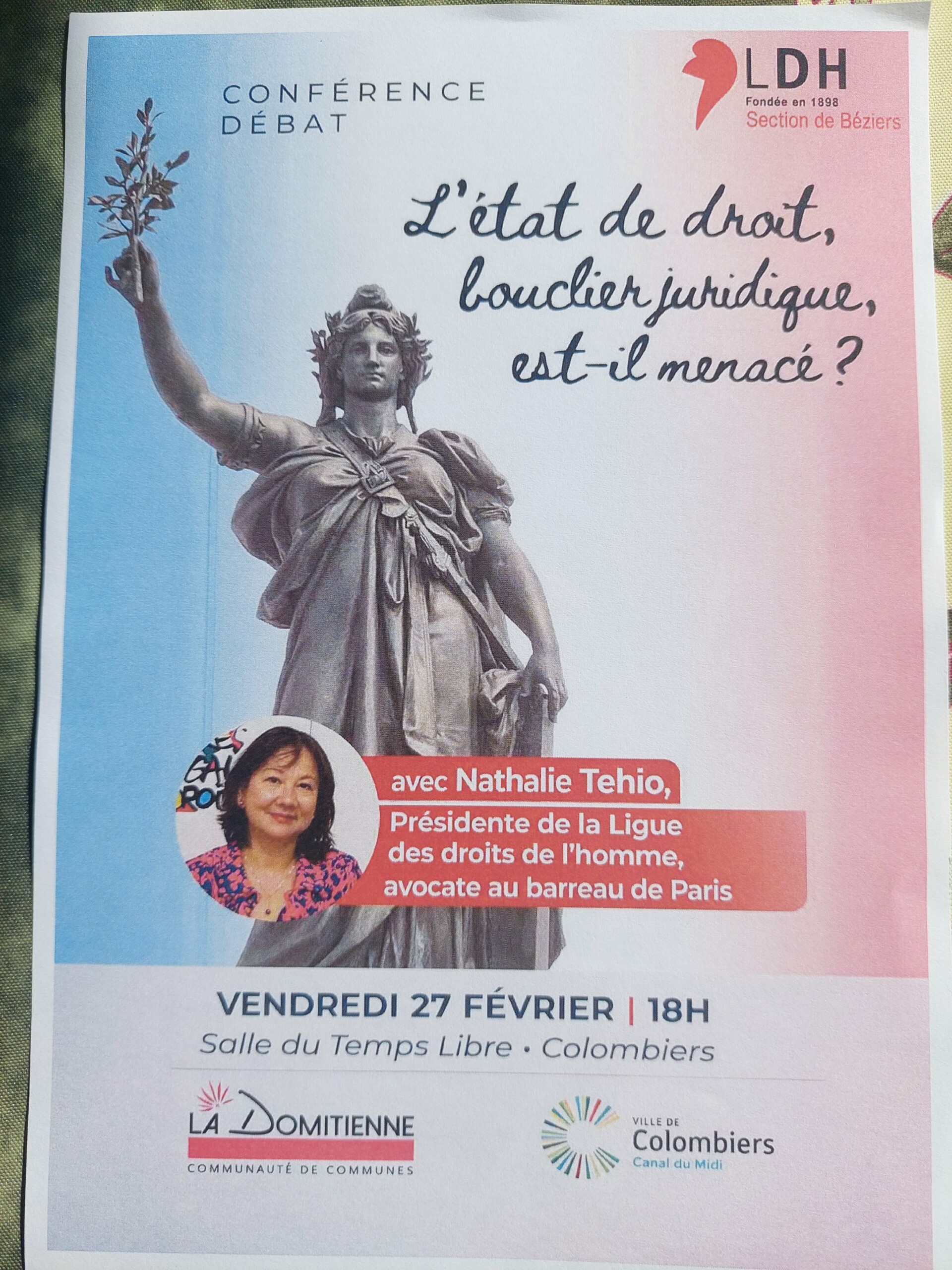 En partenariat avec la ville de Colombiers et la communauté de communes La Domitienne, la LDH section de Béziers invite la Présidente nationale de la Ligue des droits de l’Homme, Nathalie Tehio a une conférence « L’état de droit, bouclier juridique, est-il menacé ? », le vendredi 27 février à 18h à Colombiers Salle du Temps Libre, 15 avenue de Béziers, Colombiers.